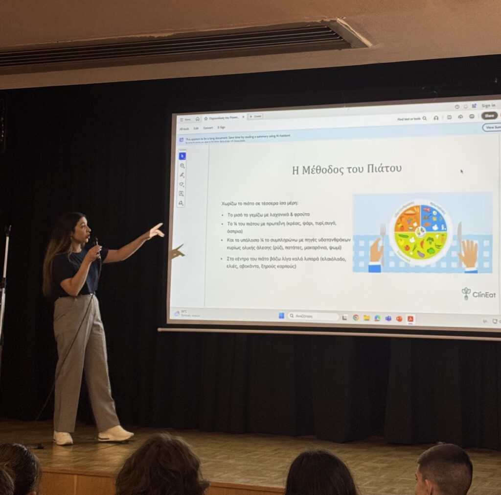 Με αφορμή την Παγκόσμια Ημέρα Διατροφής (Πέμπτη 16 Οκτωβρίου), το Λύκειό μας διοργάνωσε μια ξεχωριστή εκδήλωση ενημέρωσης και ευαισθητοποίησης με προσκεκλημένη την κλινική διαιτολόγο – διατροφολόγο κ. Σωτηρία Σερεμέτη. Η εκδήλωση είχε στόχο να αναδείξει τη σημασία της σωστής και ισορροπημένης διατροφής στην καθημερινότητα των μαθητών, αλλά και τη σύνδεσή της με τη σωματική και ψυχική υγεία.