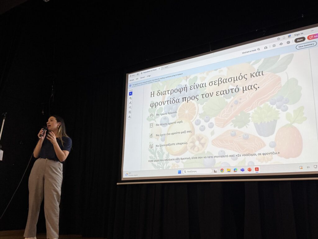 «Η σωστή διατροφή δεν είναι δίαιτα – είναι φροντίδα για το σώμα και το μυαλό μας», ανέφερε χαρακτηριστικά η κ. Σερεμέτη, ενθαρρύνοντας τους μαθητές να δουν τη διατροφή ως σύμμαχο στην καθημερινότητά τους.